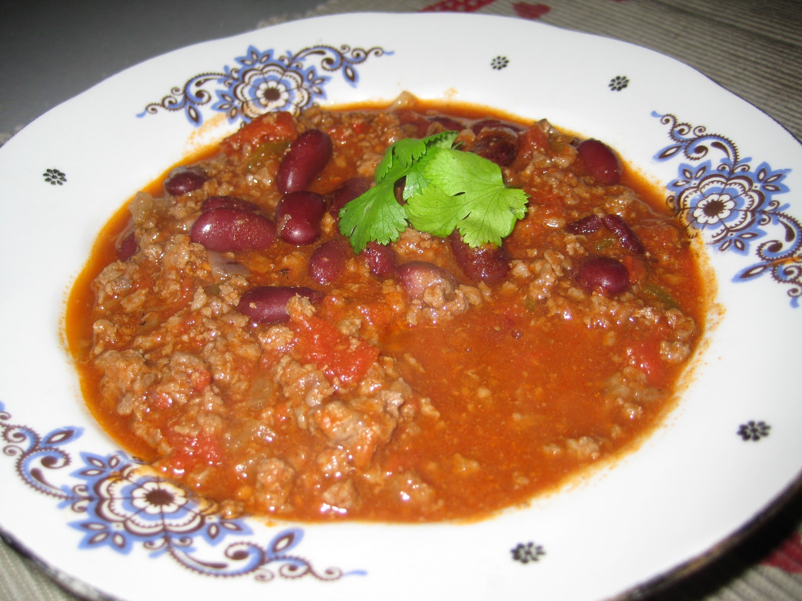 Prae sibul ja küüslauk õlis pehmeks. Lisa tükeldatud tšillipipar ja tšillipulber, vürtsköömned, veidi soola, pipart. Lisa hakkliha, sojakaste ja veiniäädikas, pruunista. Lisa tomatikonserv ja püree, kaneelipulk. Hauta 1,5 tundi. Peale 1 tundi lisa ka nõrutatud oad.