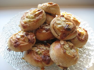 Hõõru pärm vähese suhkru ja soolaga vedelaks, lisa käesoe piim ja sega segamini. Lisa kardemon, ülejäänud suhkur, toasoe või kuubikutena ja enamus jahust . Sõtku ühtlaseks tainaks, kuni tainas lööb kausi servade küljest lahti. Lase kerkida rätiku all u 1 tund( kuna lisasin rukkijahu, siis tainas ei kerki nii hästi, lasin kerkida umbes 2 tundi). Tükelda rabarberid väikesteks kuubikuteks, riivi külmkapis olnud martsipan. Rullli tainas ülejäänud jahusel laual ristkülikuks. Määri peale toasoe või ning puista peale rabarber ja martsipan. Rulli tihedalt kokku ja lõika tükkideks(umbes 2-3 cm laiused rullid) Tõsta küpsetuspaberiga kaetud ahjuplaadile ja lase rätiku all kerkida veel 30 minutit. Määri pealt lahtiklopitud munaga ja puista peale mandlilaastud. Küpseta 225 kraadi juures 10-15 minutit. Ahjusoojalt on parimad:)