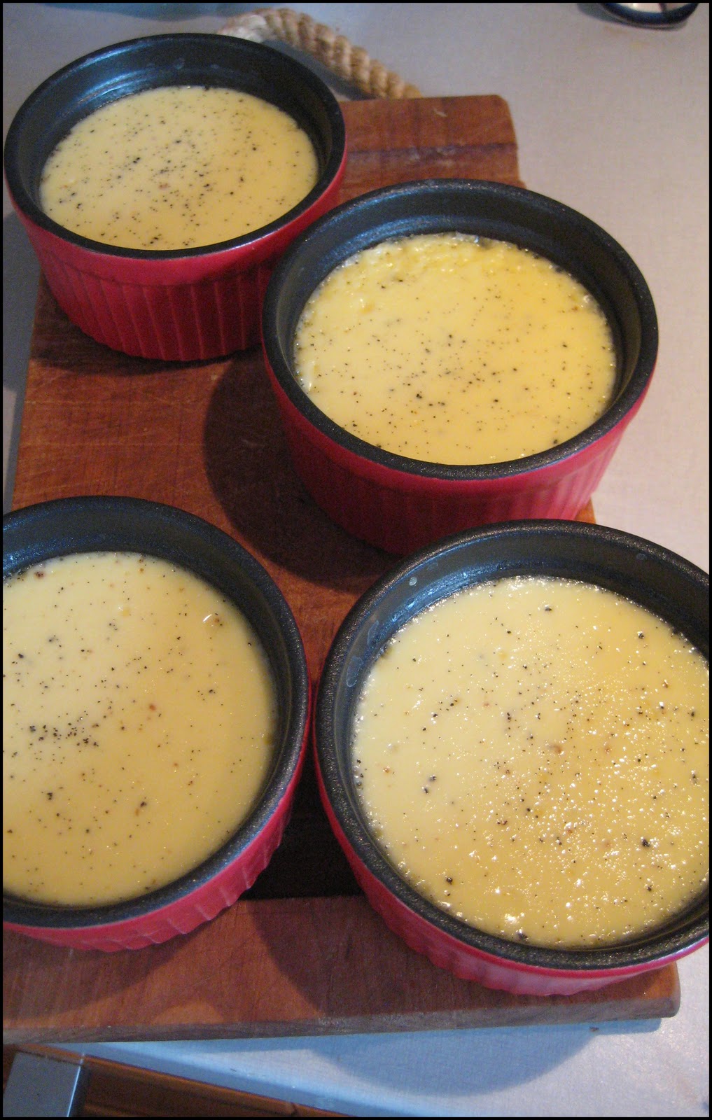 Kalla kooresegu võiga määritud väikestesse ahjuvormidesse ja aseta veevanni. Kata fooliumiga ja pane 160 kraadise ahju keskosasse 50 minutiks. Kreemid peaks olema läbi küpsenud aga ikka veel ”võbisema”.