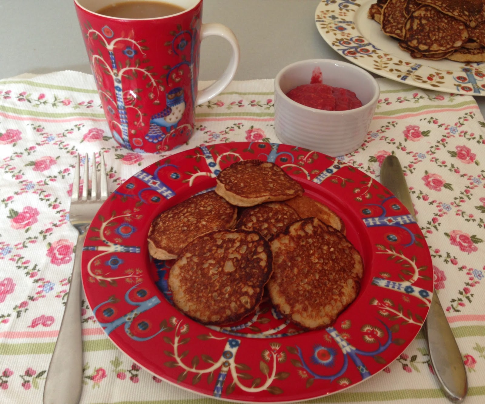 Blenderda kõik koostisosad ühtlaseks ja prae vähese rasvainega väikesed pannkoogid. Serveeri näiteks vaarikamoosiga 🙂