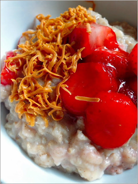 Ma tean mida te mõtlete, juust ja puder, mida? Ja sinna juurde veel banaan ja maasikad? Aga see on nii hea! Tavaliselt süüakse Norras pruuni juustu (brunost) vahvlite ja banaaniga, siis peaks see kooslus sobima ka kaerahelbepudrusse. Vähemalt selline oli minu mõttekäik 🙂 Kui tihti tundub juustu lisamine magusale toidule pigem võõras ja imelik, siis brunost-i tuleks võtta pigem kui kreemjat, maitsvat karamellikuubikut, kui juustu. Lastele brunost-i maitsta andes, arvasid nad, et see on karamellikomm.
