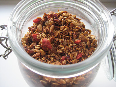 Ma ei saa aru, miks ma enne pole ise müslit teinud. Alati on mulle midagi mitte meeldinud poe müsli juures, kas liiga magus või kibe järelmaitse või siis nt. soovimatud lisandid nagu rosinad:) Ise tehtud granola on ka sellepärast parem, et saad kontrollida palju suhkrut/mett paned ja palju rasvaianet kasutad või kas üldse.Ja muidugi tuleb see ka palju odavam ja mis kõige tähtsam MAITSVAM! Siin retseptid on enamus õlist asendatud õunapüreega. Retsept on võetud Nigella Lawsoni raamatust Feast, mugandustega. Sellest tuleb umbes 1 kg müslt.